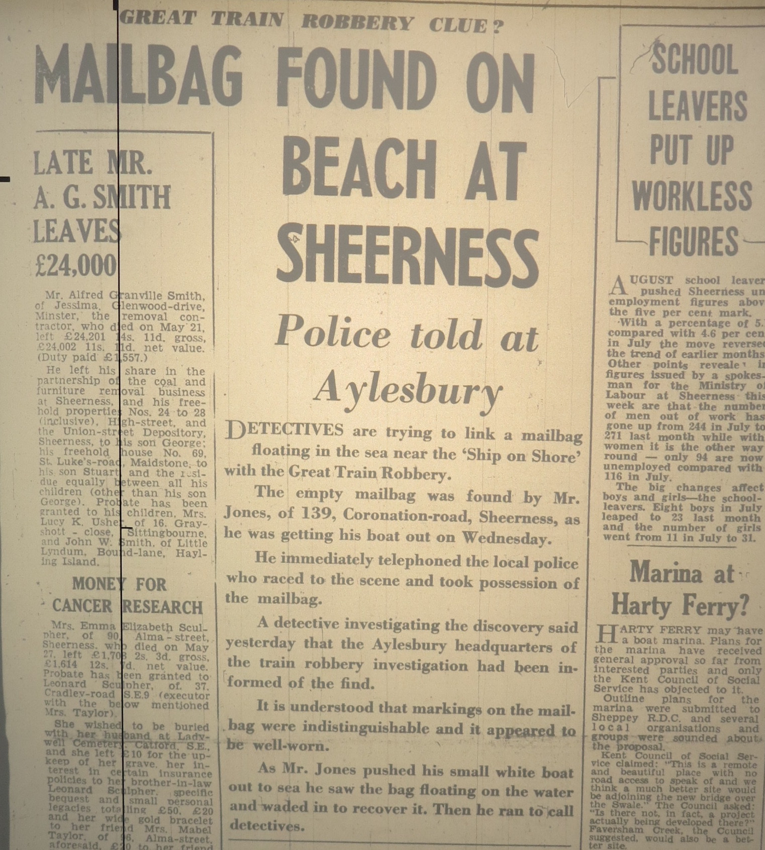 on Shore’ when he noticed a mail bag drifting in the sea. He immediately telephoned the Sheerness police