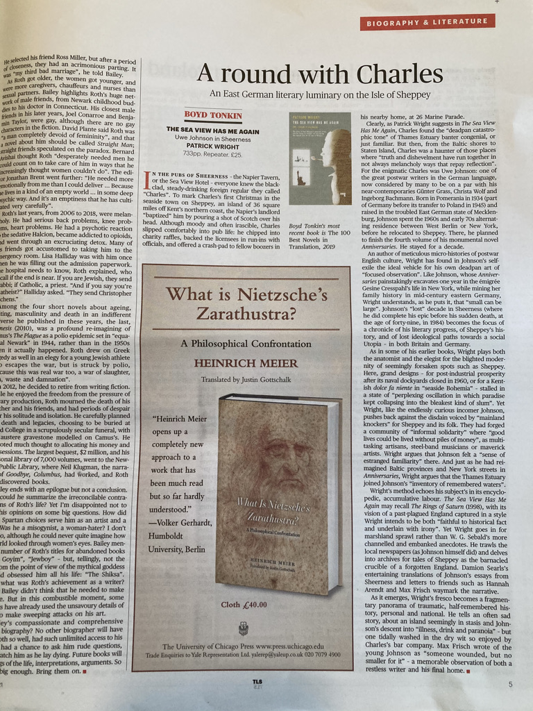 “A double ‘biography’ of the great but always tempestuous German writer Uwe Johnson and his ultimate home, the gritty and disreputable Isle of Sheppey. ‘Biography’ is in quotes because Wright is a saboteur of genres and his books encompass multiple worlds. I stand in awe of what he has accomplished here”.
